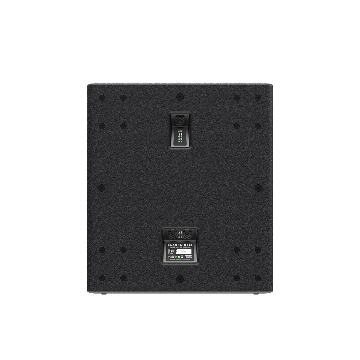 Designed for versatile deployment, Q118 can be used individually, stacked or flown using integral M10 inserts. It also includes an M20 1.4” (35 mm) pole-mount fitting for seamless integration with other loudspeakers in BlacklineQ series. There are two signal link outputs—one positioned at the top and one at the bottom of the enclosure when oriented vertically. This allows for flexible, discreet and tidy signal connections to other BlacklineQ loudspeakers, regardless of setup.